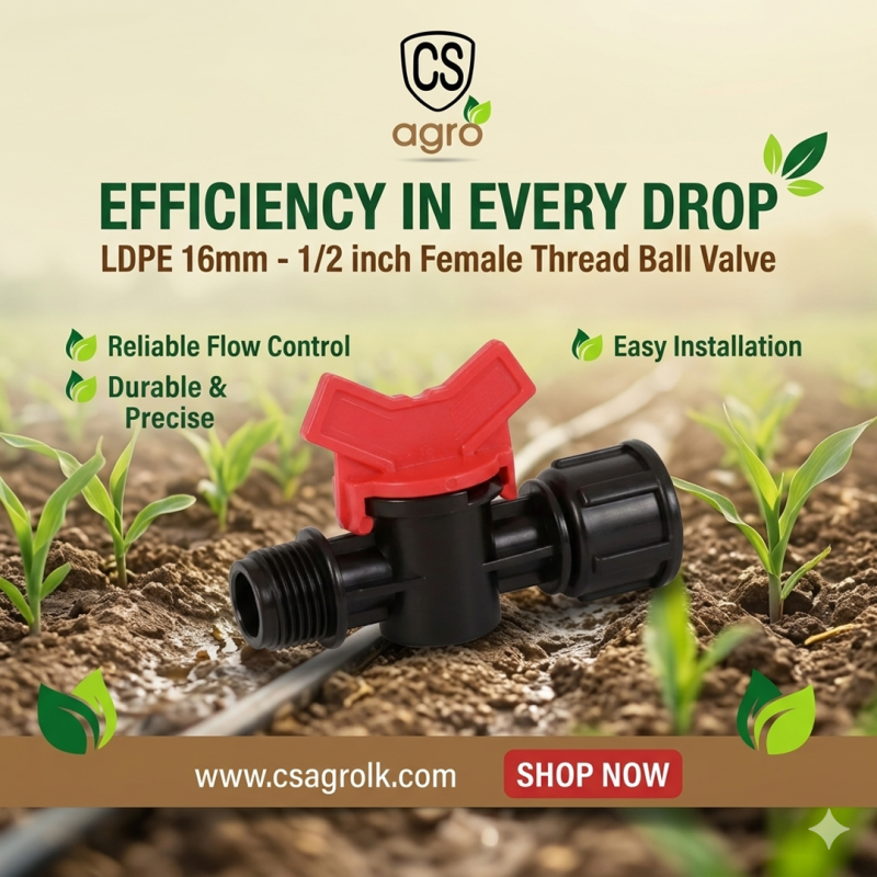 ake complete control of your agricultural irrigation systems with the CS Agro LDPE 16mm to 1/2″ Female Thread Ball Valve. Designed for durability and precision, this high-quality mini valve is an essential component for drip irrigation, greenhouse watering, and modern farming setups. Built to handle everyday agricultural demands, it ensures a leak-free connection and smooth water flow management.