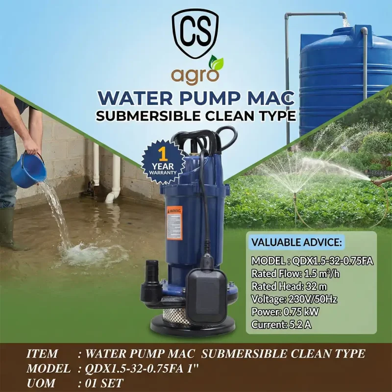 The Water Pump MAC is a durable and efficient submersible pump designed for clean water applications. Ideal for domestic, agricultural, and general water management needs, it offers powerful performance for tasks such as garden irrigation, water transfer, and drainage. With a rated flow of 1.5 m³/h and a lifting head of 32 meters, this pump ensures smooth and reliable water supply. It operates on 230V/50Hz and delivers 0.75 kW of power, making it energy-efficient and suitable for continuous use. Backed by a 1-year warranty, it is a dependable choice for homeowners, farms, and industrial environments.